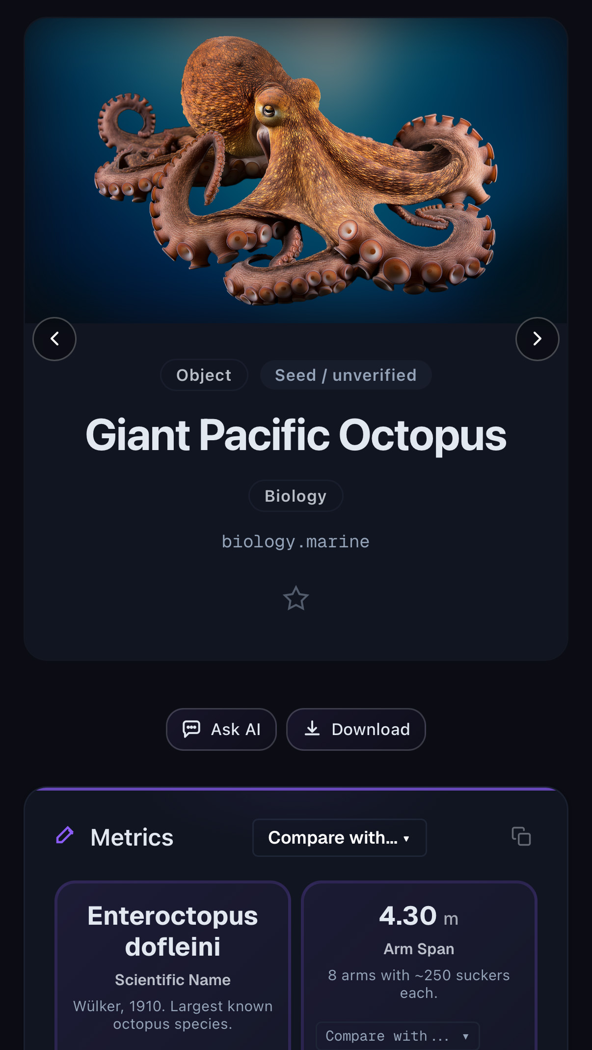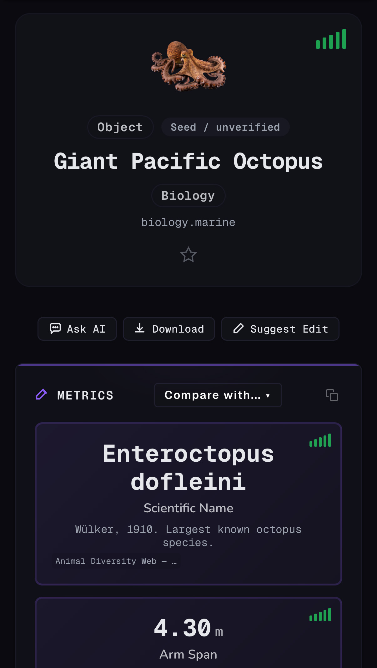 Every scientific concept becomes a card with metrics, relations, explanations on three levels, and full provenance. Structure makes knowledge tangible.